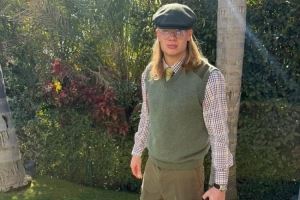 哈兰德社媒晒出穿搭照片,背景是郁郁葱葱的绿色植被,哈兰德头戴绿色帽子,身上穿着绿色马甲,内搭格子衬衫,下身穿着橄榄绿裤子,手拎黑绿色帆布包包。