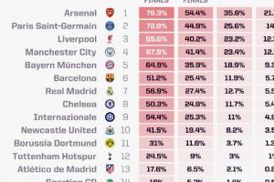 拜仁近20个赛季欧冠对巴黎胜率78%,至少对阵5次球队中胜率第3